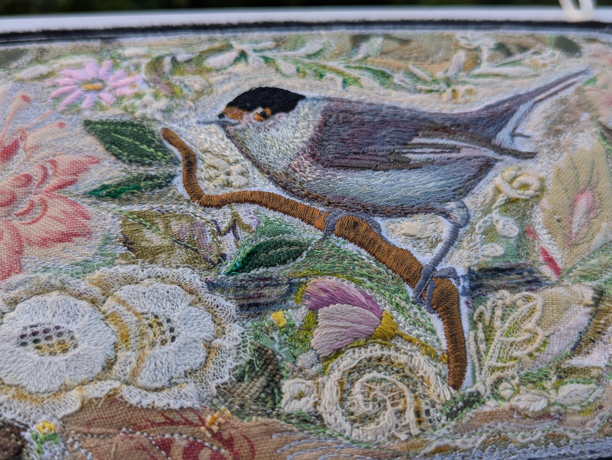 Blackcap in the Hedge - embroidery hanging